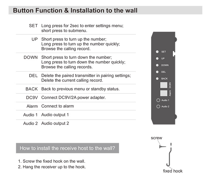 Thanks for choosing this wireless calling system. The receiver host adopts RF wireless and learning code technology. It can easily pair up to 999 channels of wireless calling transmitters and 1 manager remote controller. The receiver host uses advanced industrial micro processor and high-sensitivity superheterodyne receiving technology which make the products very stable.